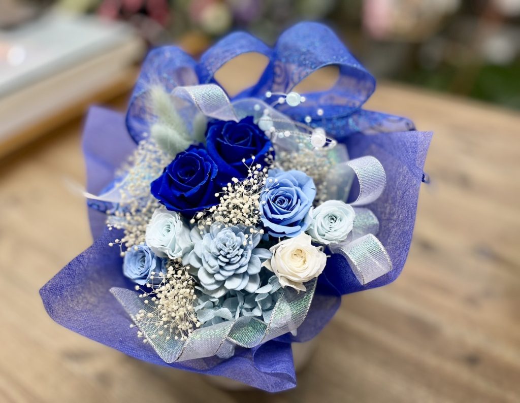 オーダーメイドプリザ 2022.10.26 ブルー系でご注文頂きました。誕生日のプレゼント用です。爽やかな、仕上がりになりました。ボリュームあるプリザーブドフラワーができました。 古希のお祝いに 奥様、誕生日