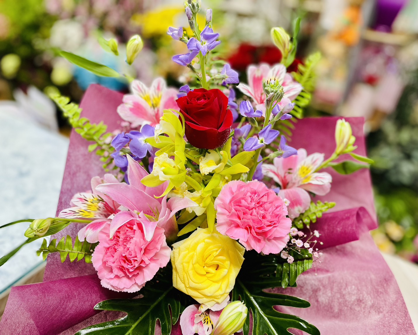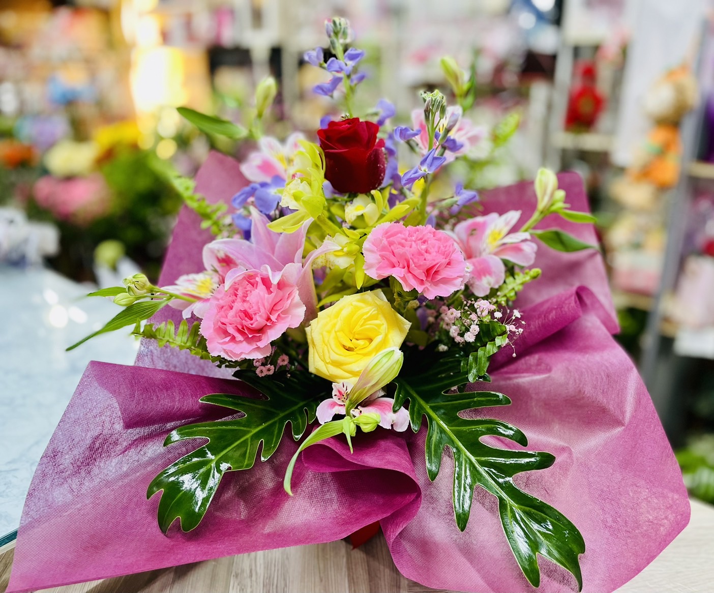 送別の花 2024.02.25 退職の方へ渡す、フラワーアレンジメントをご予約頂きました。可愛い感じでとご希望を頂きました。赤薔薇をワンポイントにして、ピンクのかすみ草でまとめ上げました。 新築祝い 3回目ワークショップ