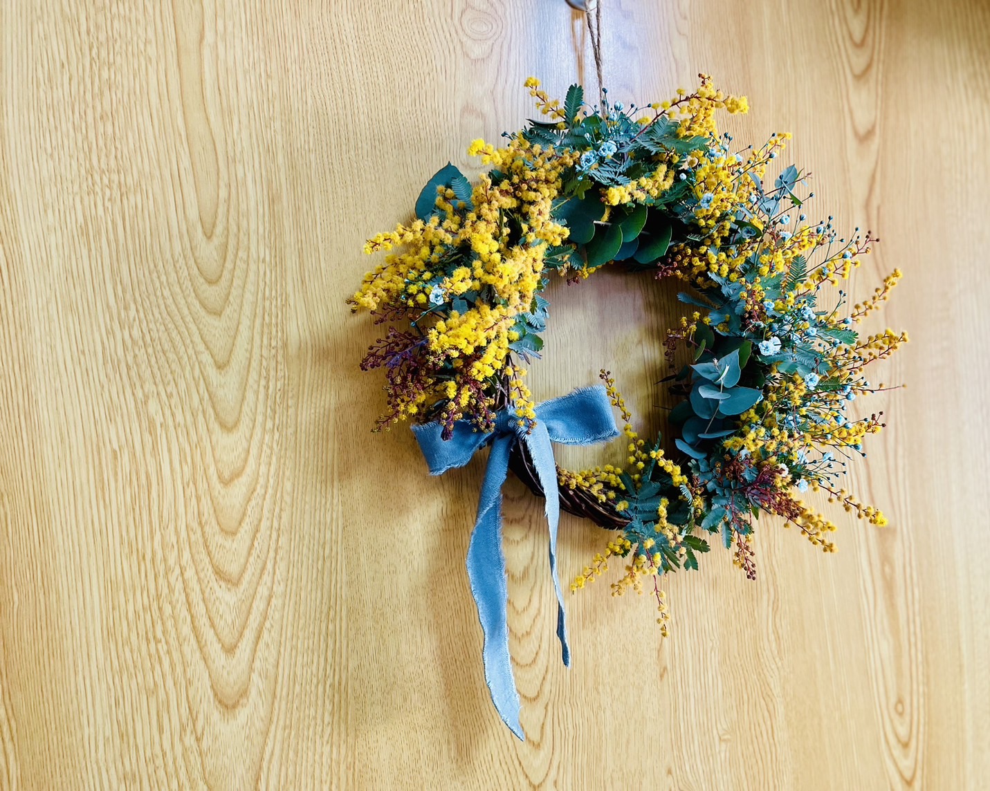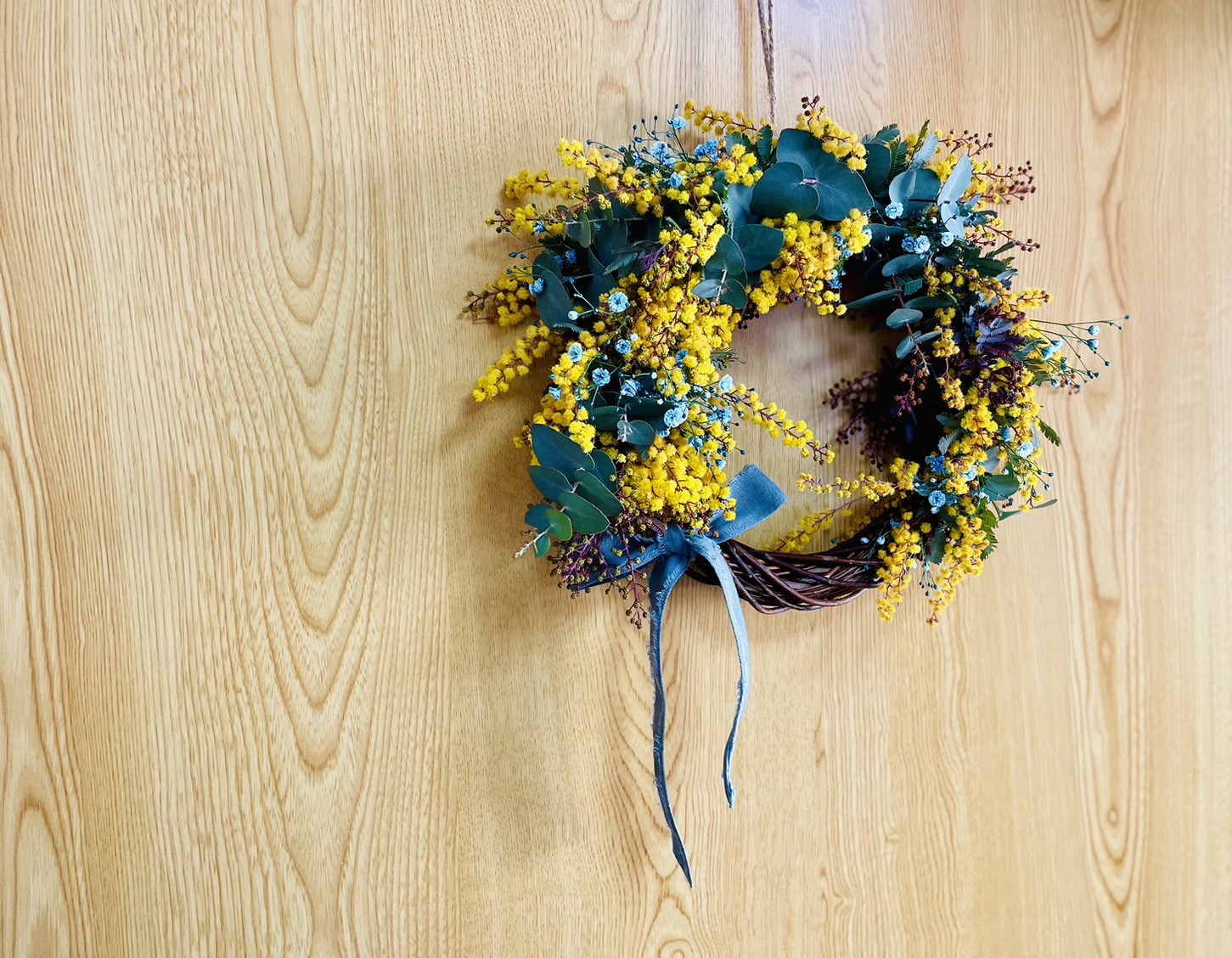 ミモザのリースを作りました。初めての方を含め2人のご参加がありました。初めてとは、思えない感性で、上手に仕上げてくれました。