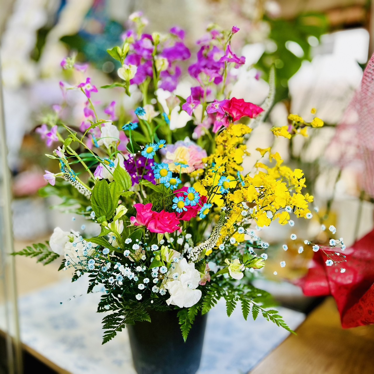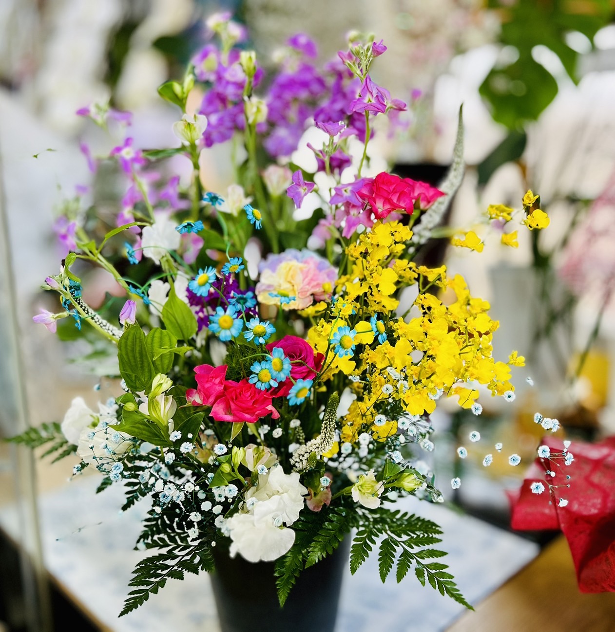 入社式 2024.04.01 入社式に飾る演台の装花をご注文頂きました。カラフルな色合いで明るく作らせて頂きました。送別の花束などでお世話になった会社様ですが、引き続きよろしくお願いします。 結婚式場へ ご就任祝い