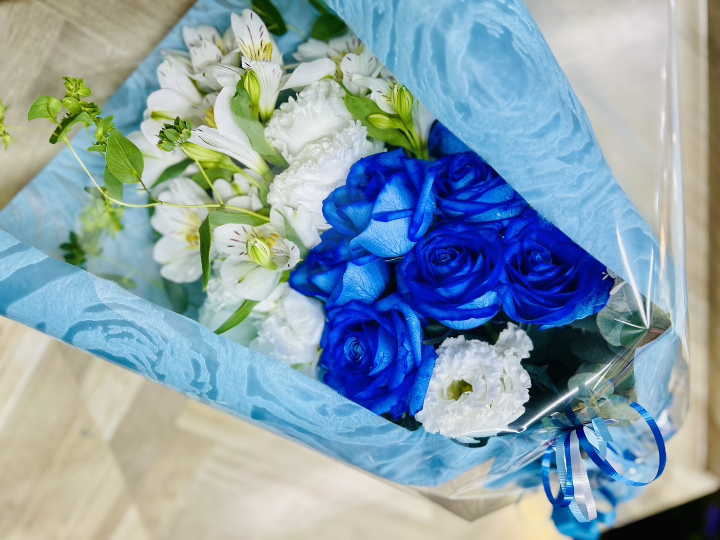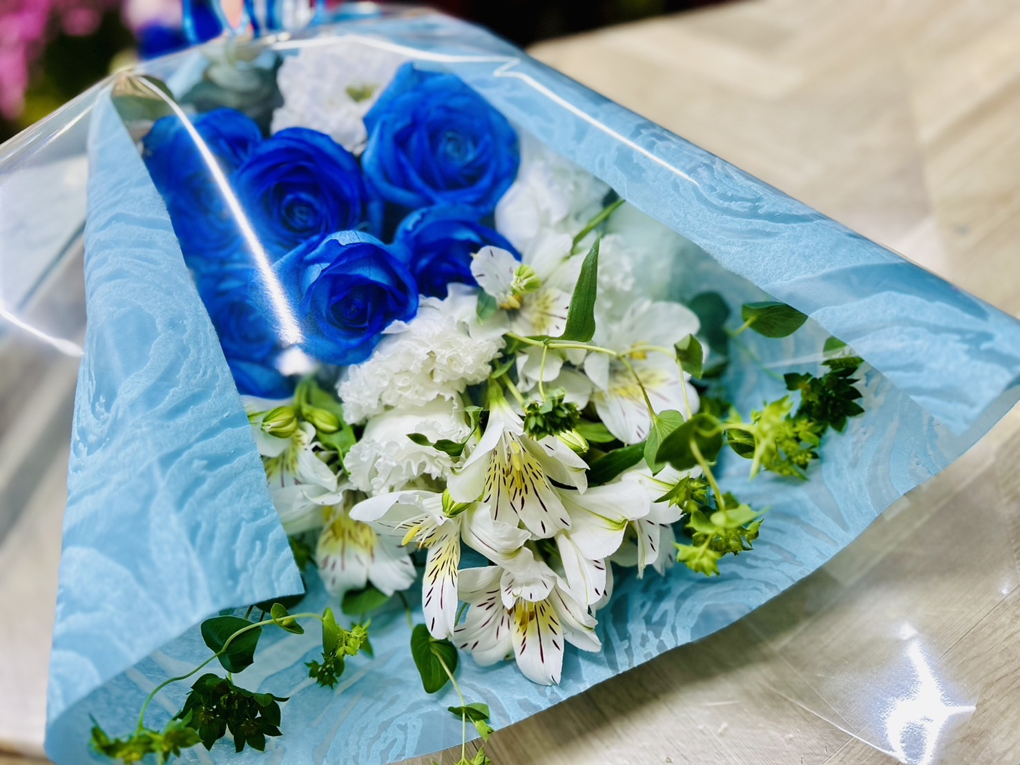 ブルー&ホワイト 2024.04.19 お客様のご希望で、ブルーと白のみの花束を作りました。男性へ贈る送別のお花です。前もって薔薇を仕入れて、ブルーに当店で染めました。ご希望の方は、ご予約下さいね。 定期のお届け 法事のお花