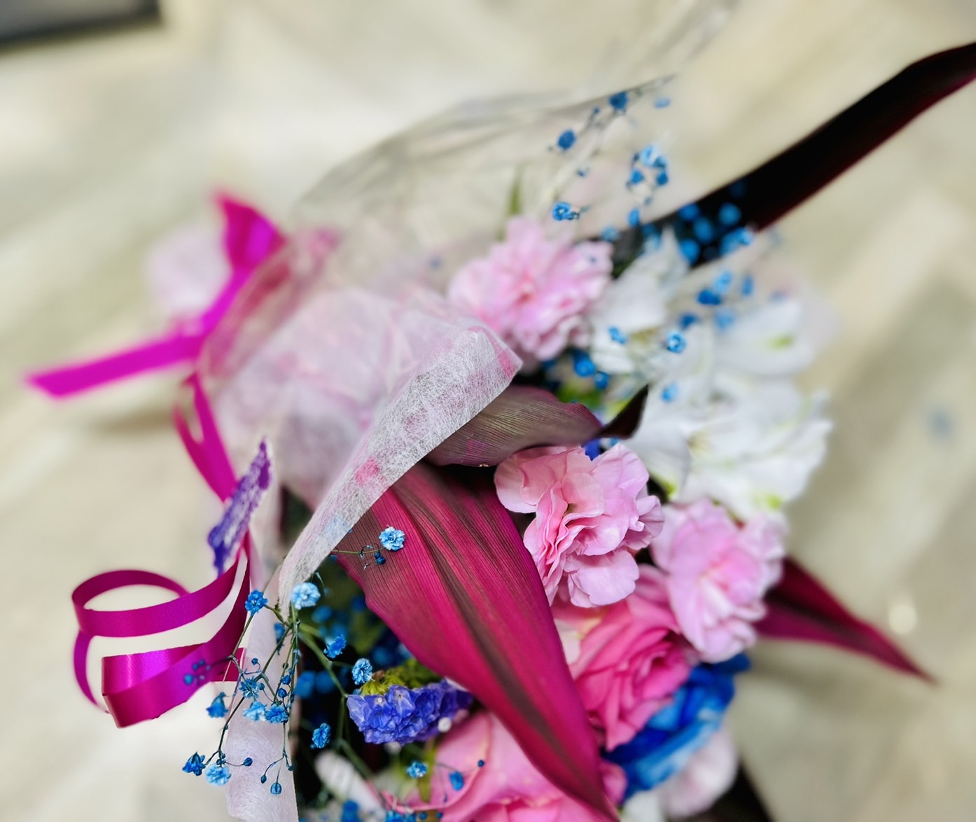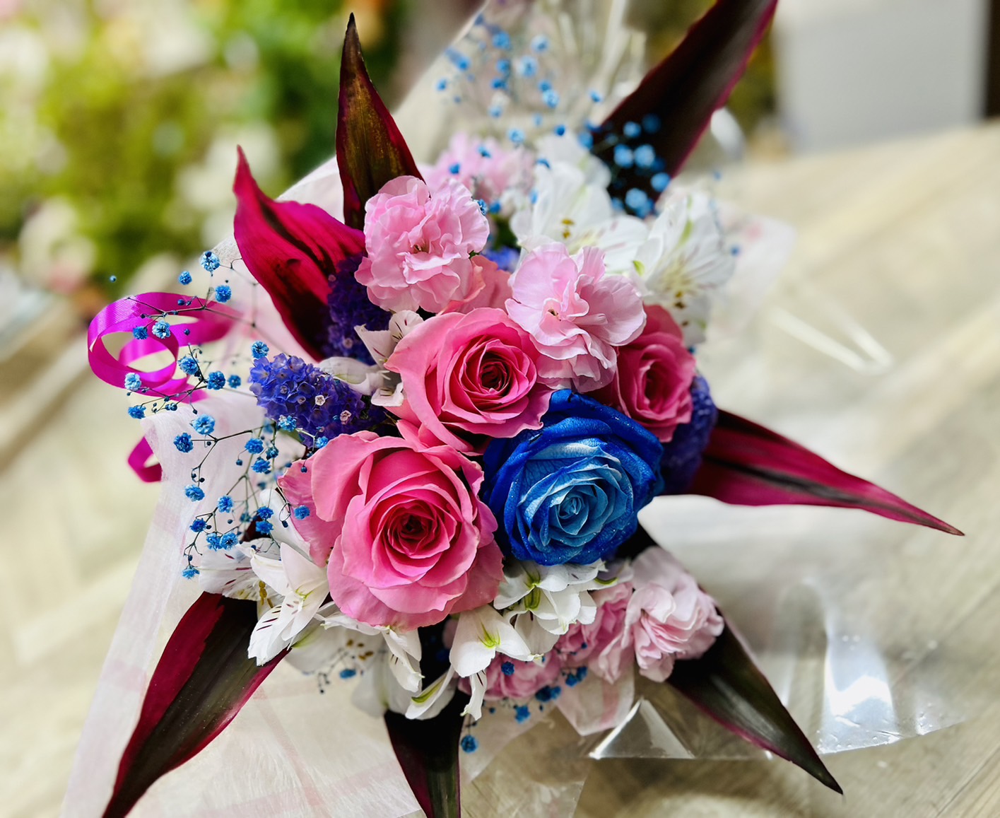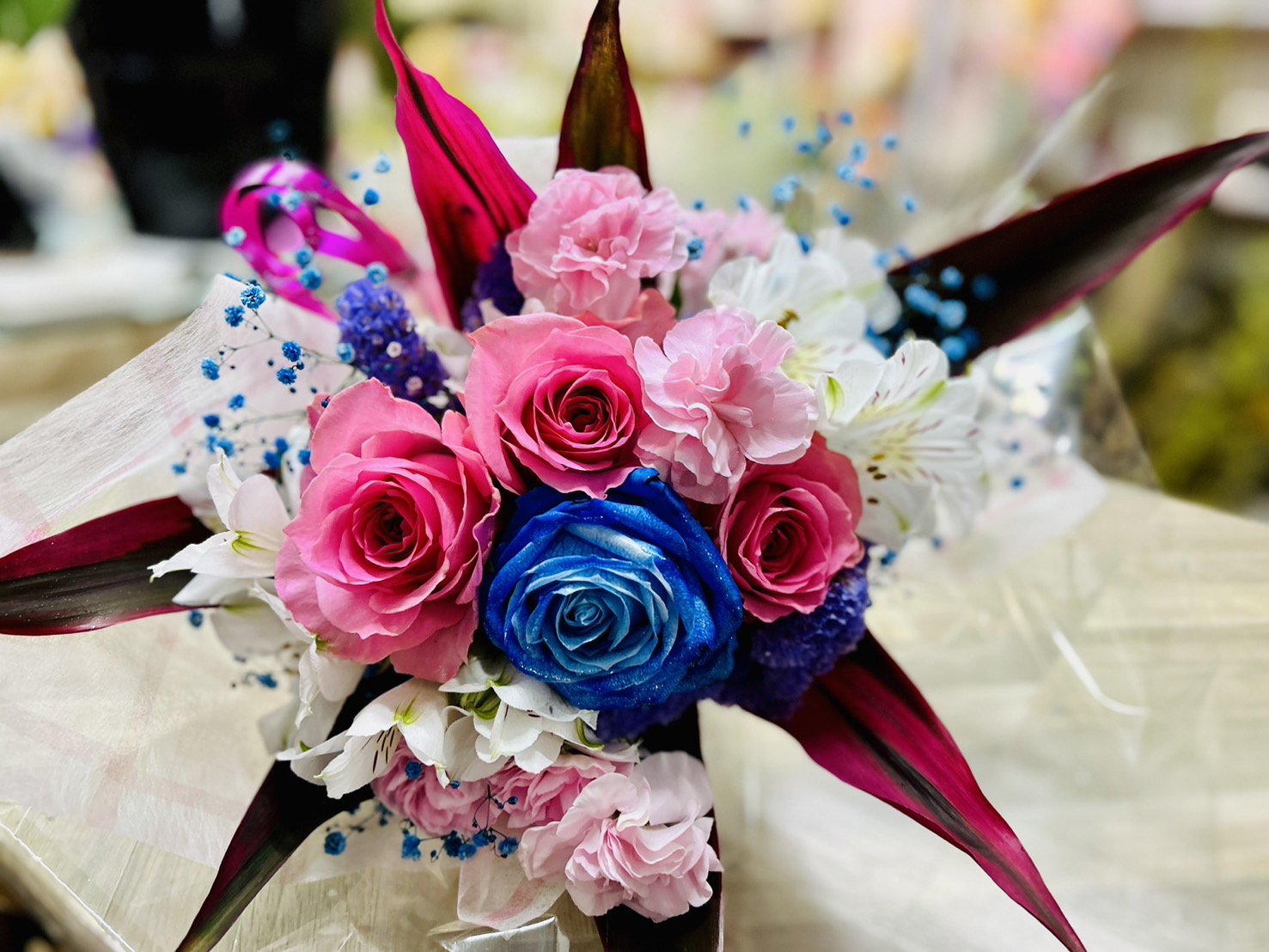 プレゼント用のブーケを作りました。奇跡と言う花言葉の青い薔薇を中心に、ピンク系でまとめました。ブルーのかすみ草も合わせてみました。
