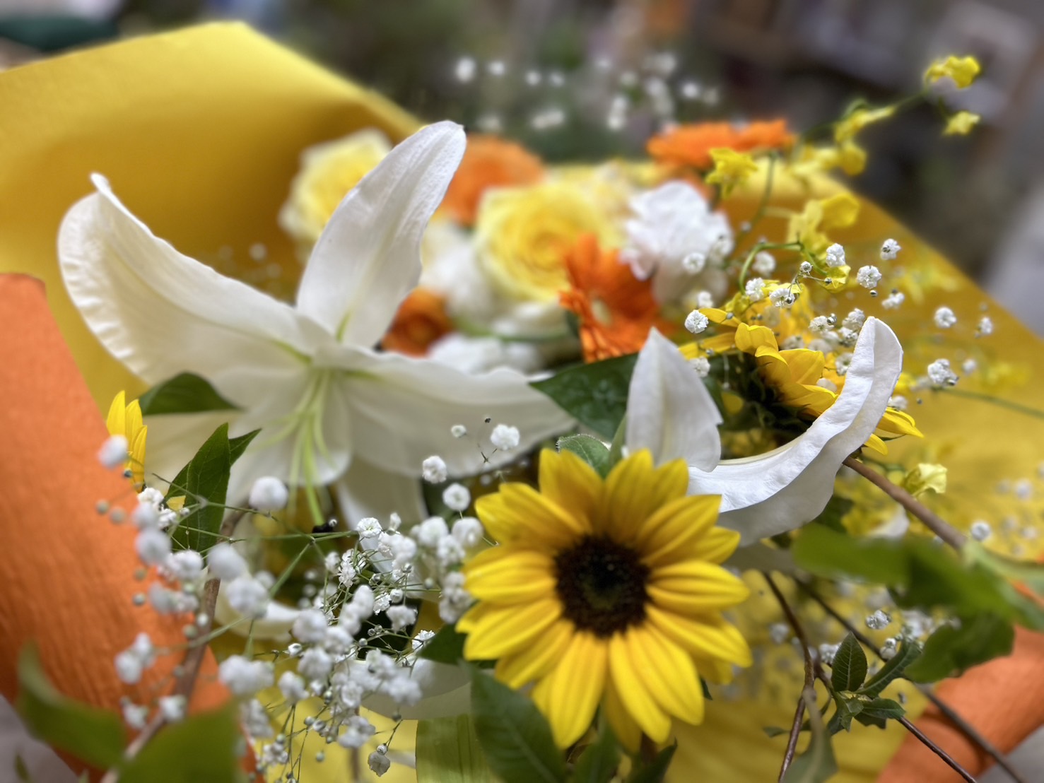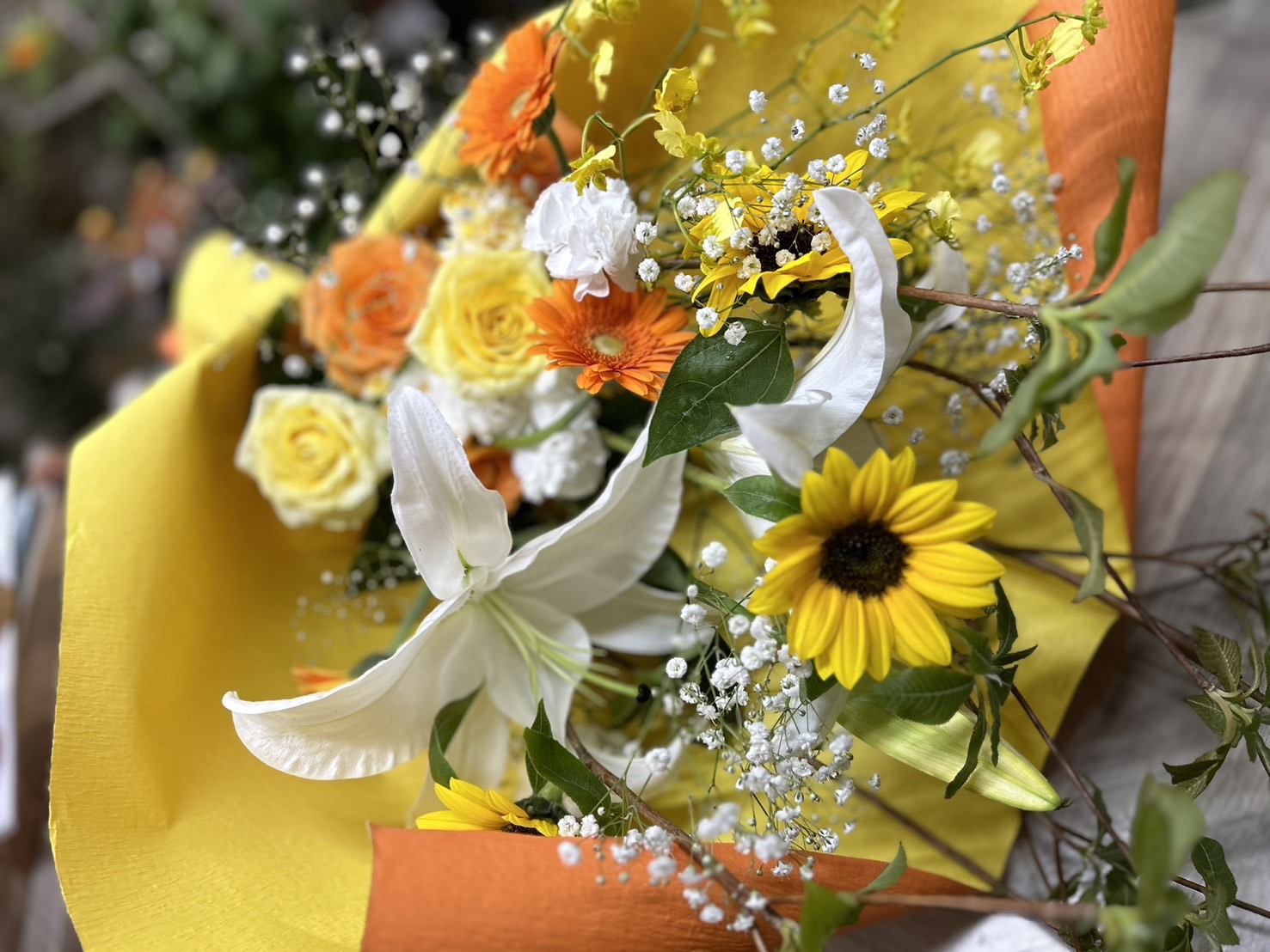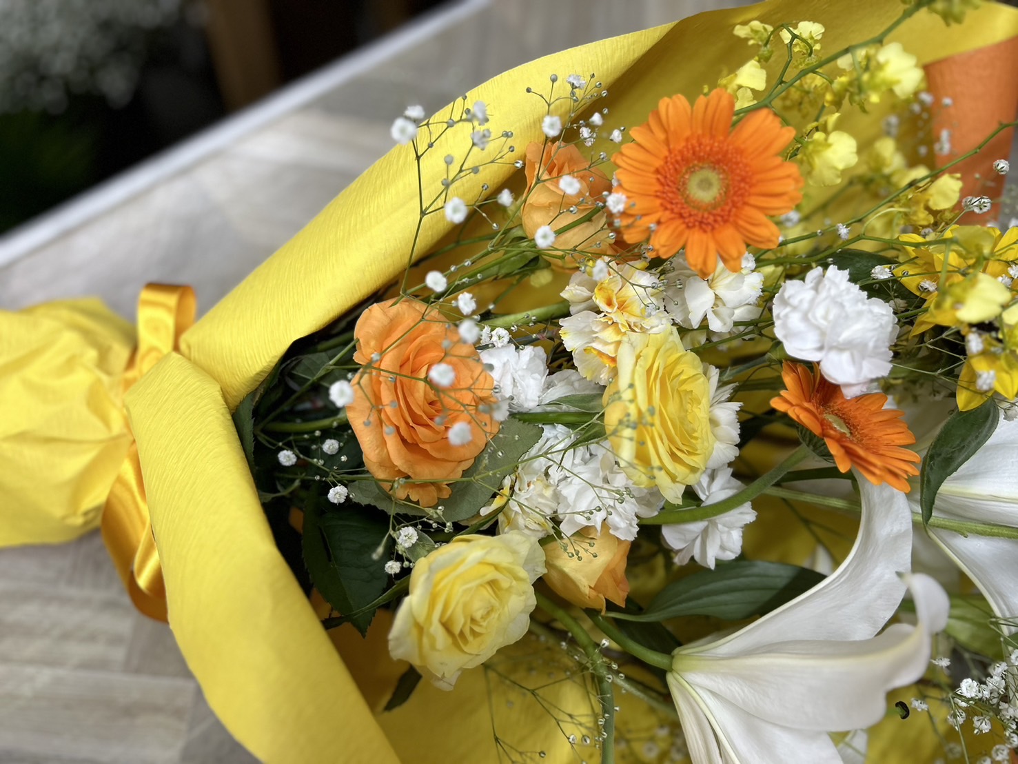 お世話になってる方へ 2024.05.01 ご近所の日頃お世話になってる方の誕生日に、花束をご予約頂きました。黄色オレンジで、まとめてほしいとご希望をもらいました。サプライズのプレゼントになるようにボリュームある花束に仕上げました。 毎年、結婚記念日には 移転祝い