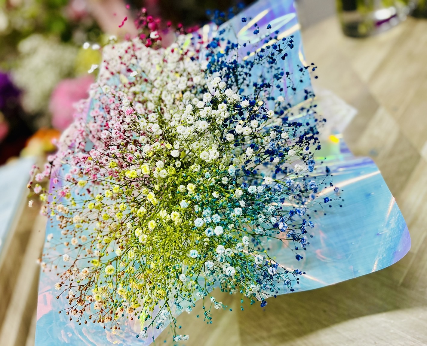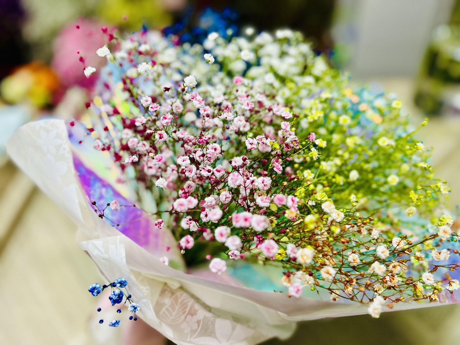 七色ブーケ 2024.05.03 かすみ草を7色に染めて、ブーケをご用意しました。ご予約でご注文頂いたので、ご希望の色に染めてからお渡しする事ができました。お店まで、ご相談下さいね。 移転祝い 真紅のバラで