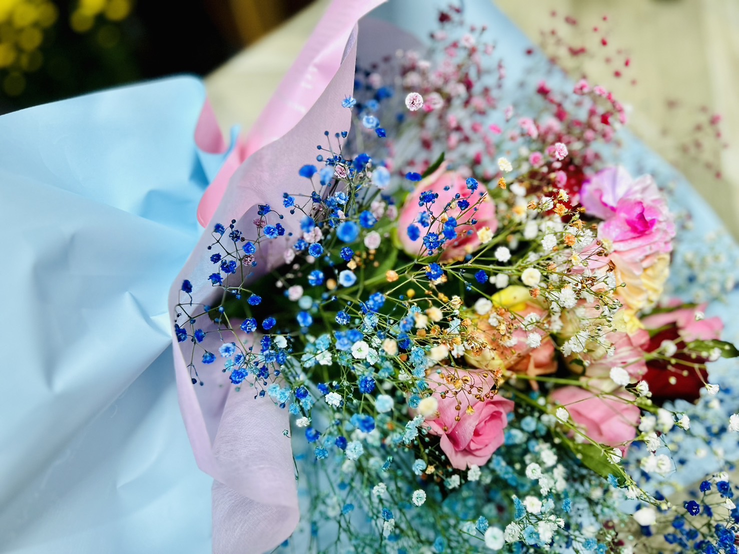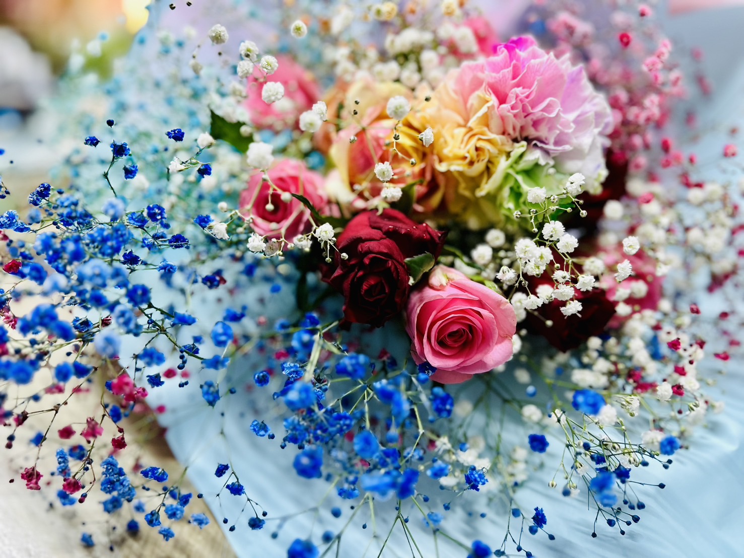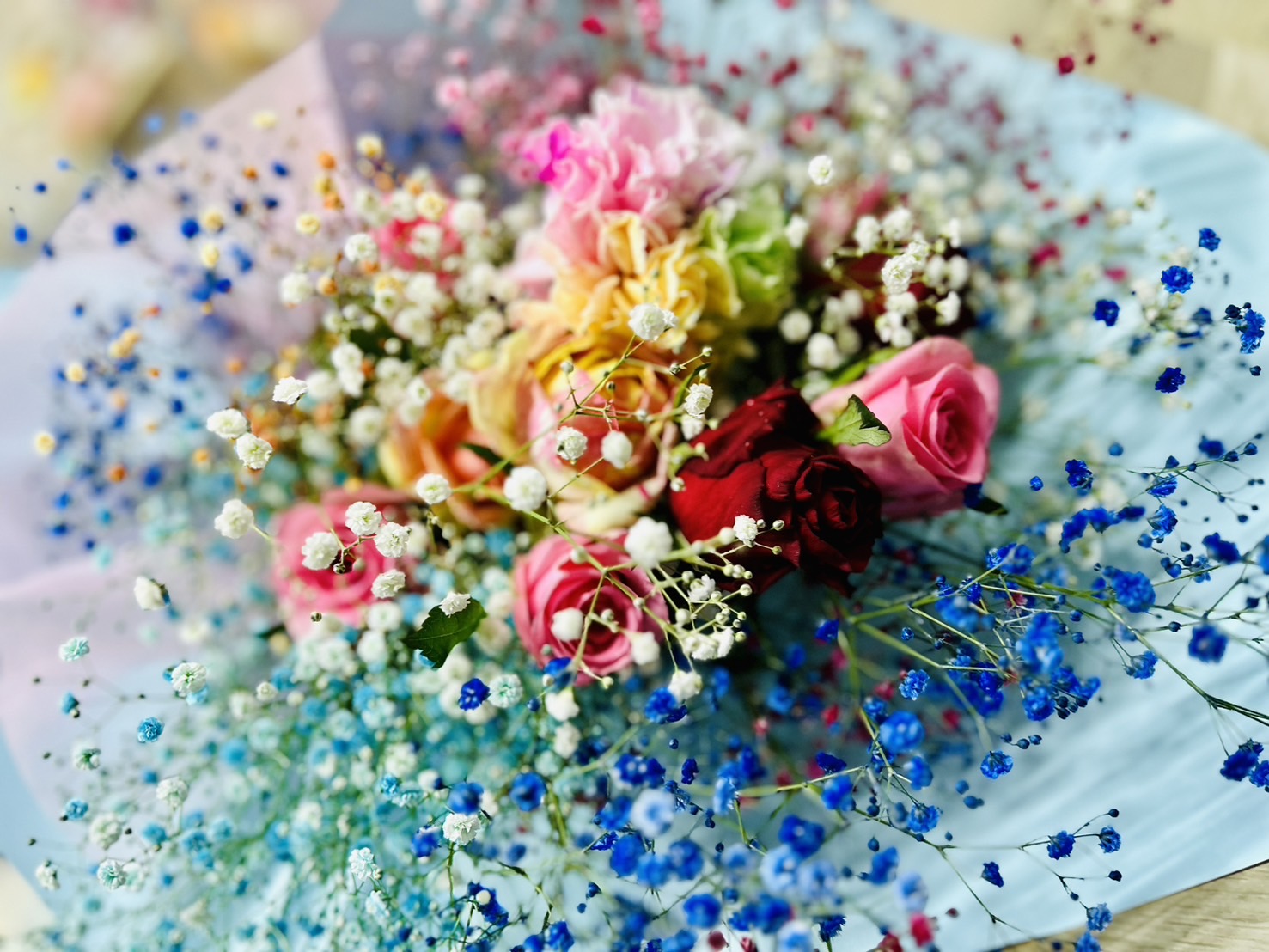 彼女の誕生日の花束をご予約頂きました。染めたかすみ草にバラを合わせて欲しいとのご希望でした。豪華なブーケができました。