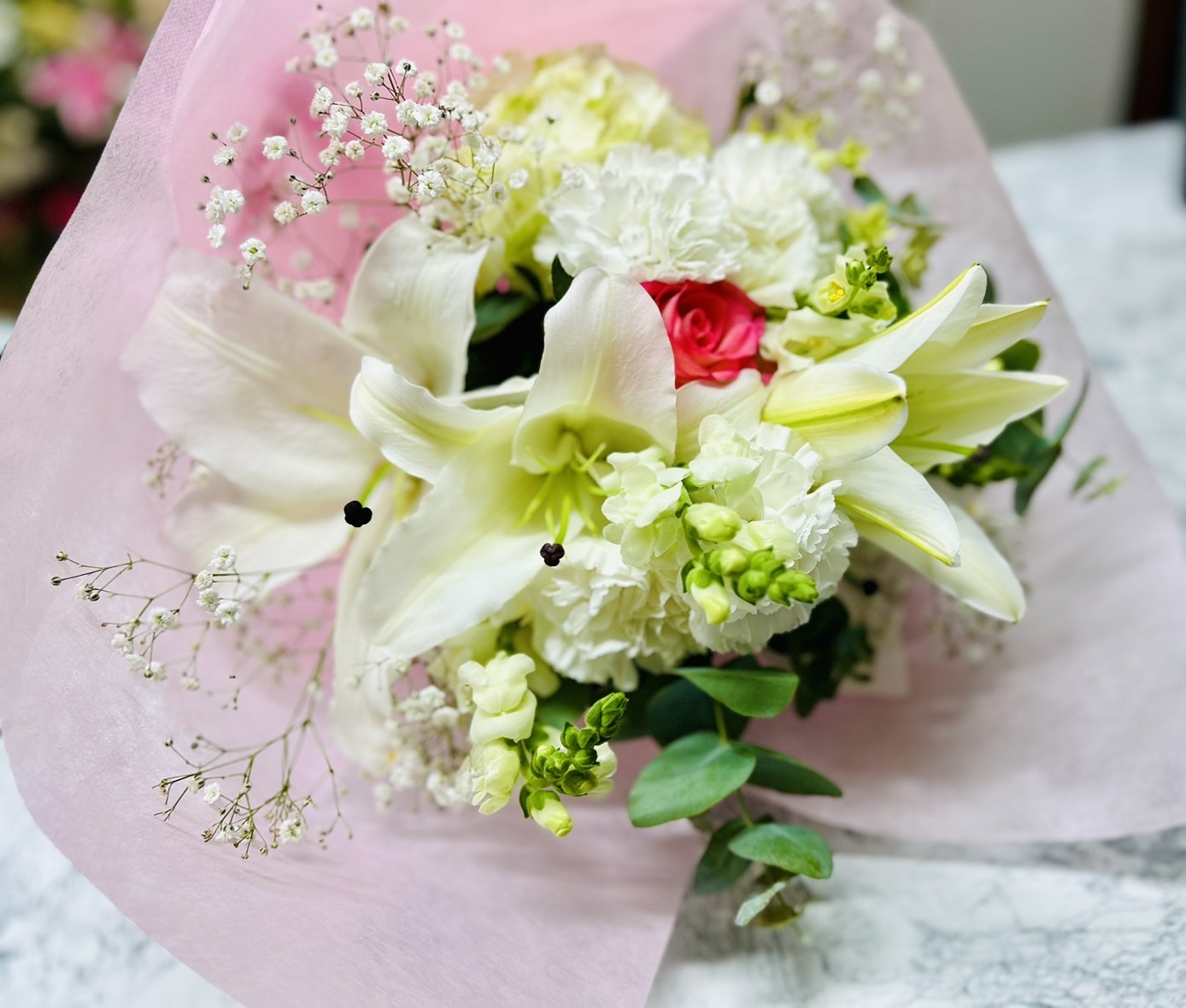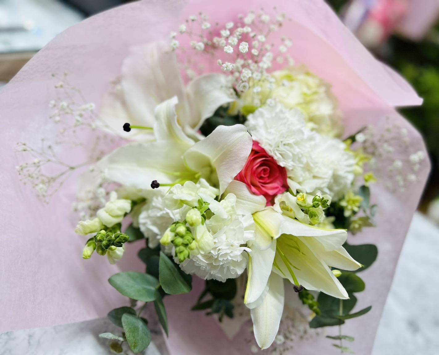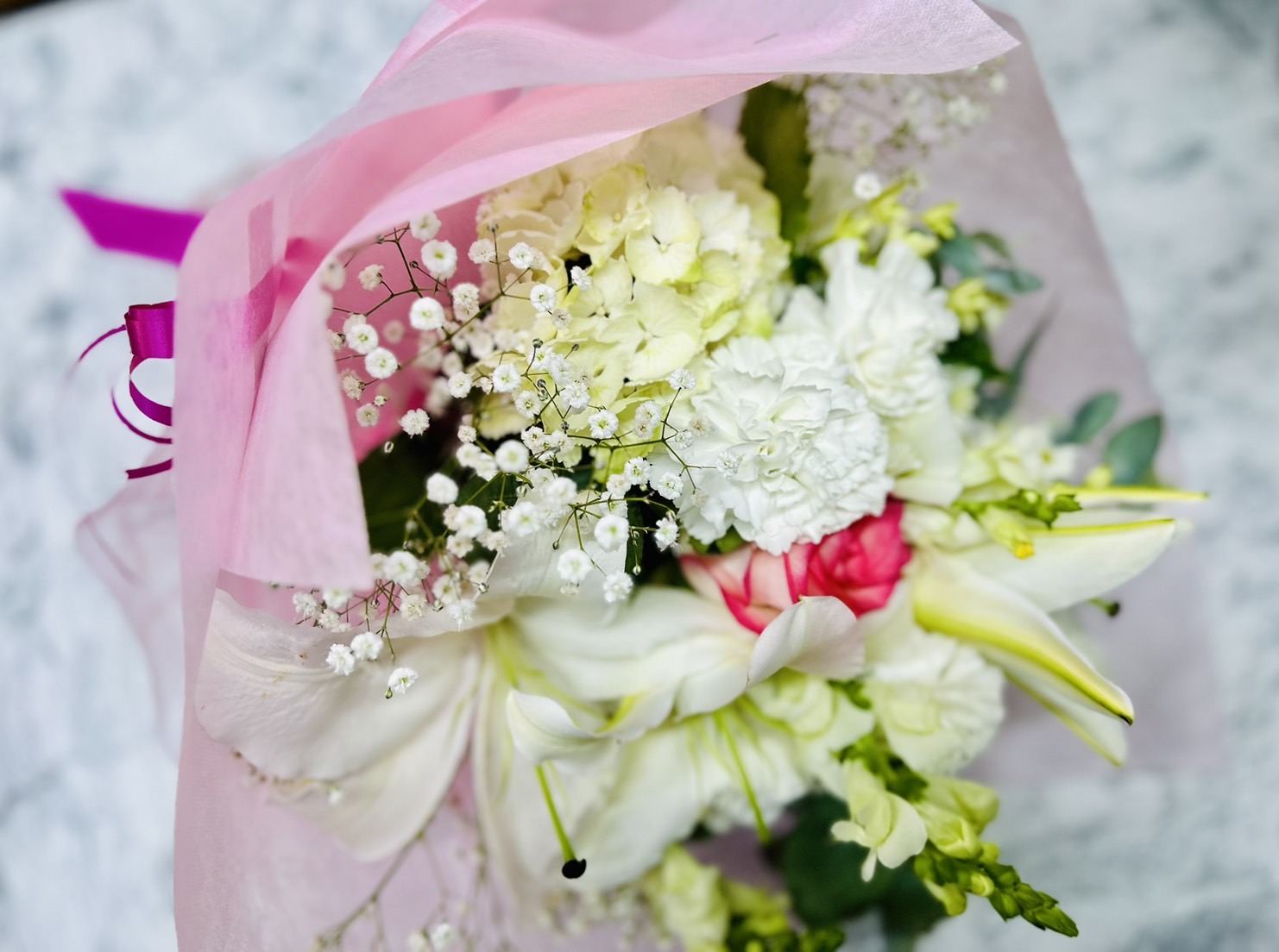 県外のお客様から、ご予約を頂きました。白系のブーケで、ポイントに一輪ピンクを入れて欲しいとの事でした。ウエディングブーケの様に、清楚な花束ができました。