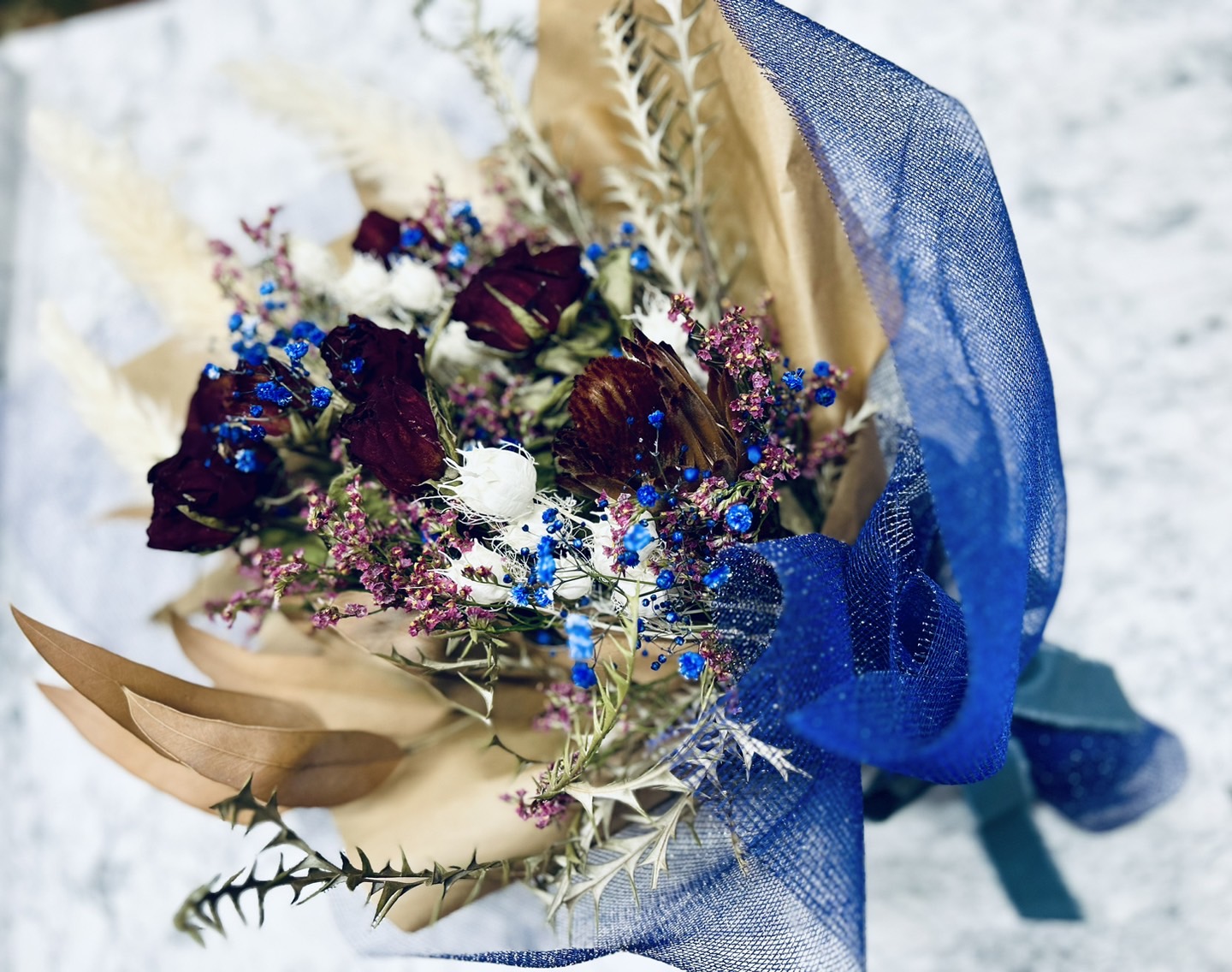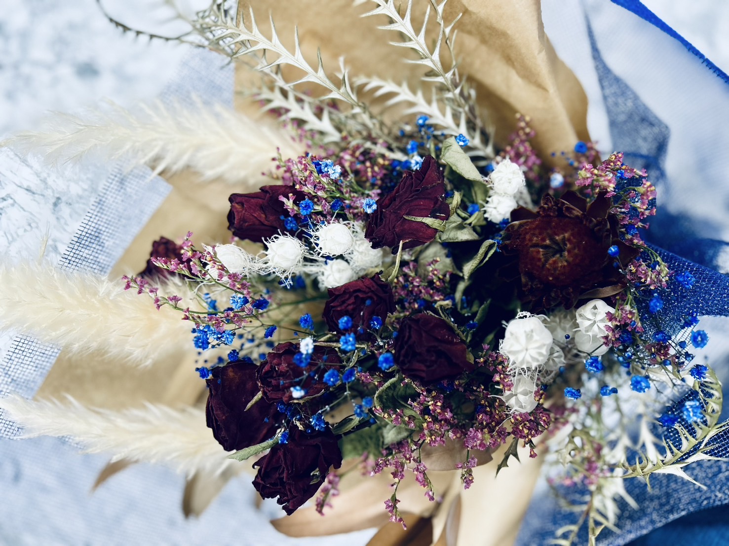 奥様の誕生日用に、オーダー頂きました。ドライフラワーを家にも大切に飾ってる奥様と言う事でした。お任せで作らせて頂きました。