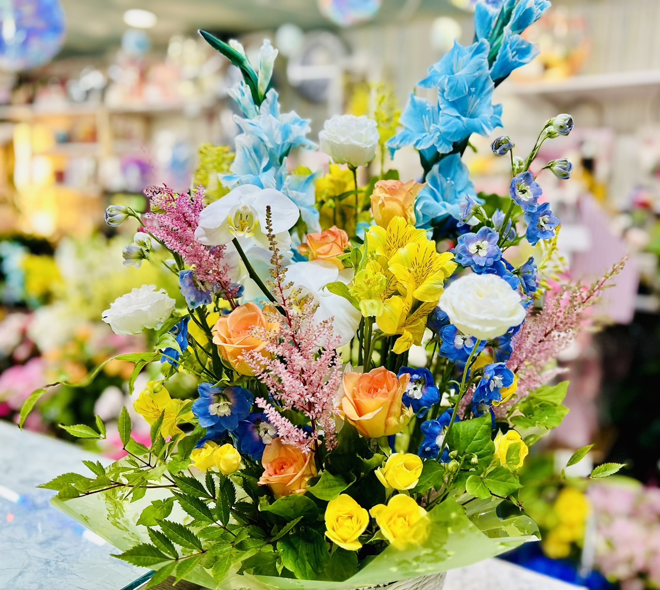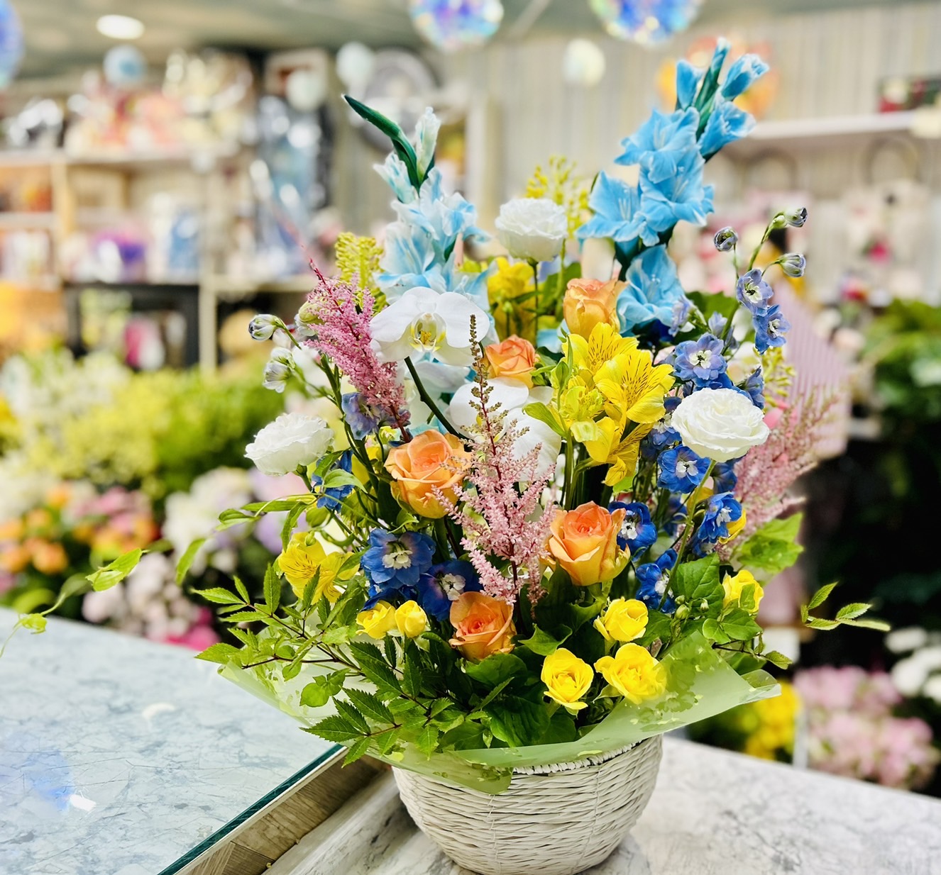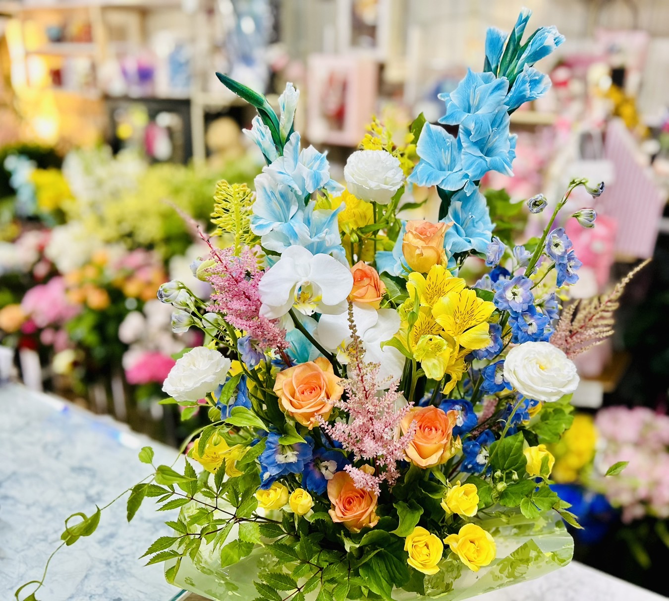 息子さんお二人から、父の三味線の発表会へ渡す花をご予約頂きました。80代で元気に演奏する父に喜んでもらいたいとのお話でした。親孝行ですね。