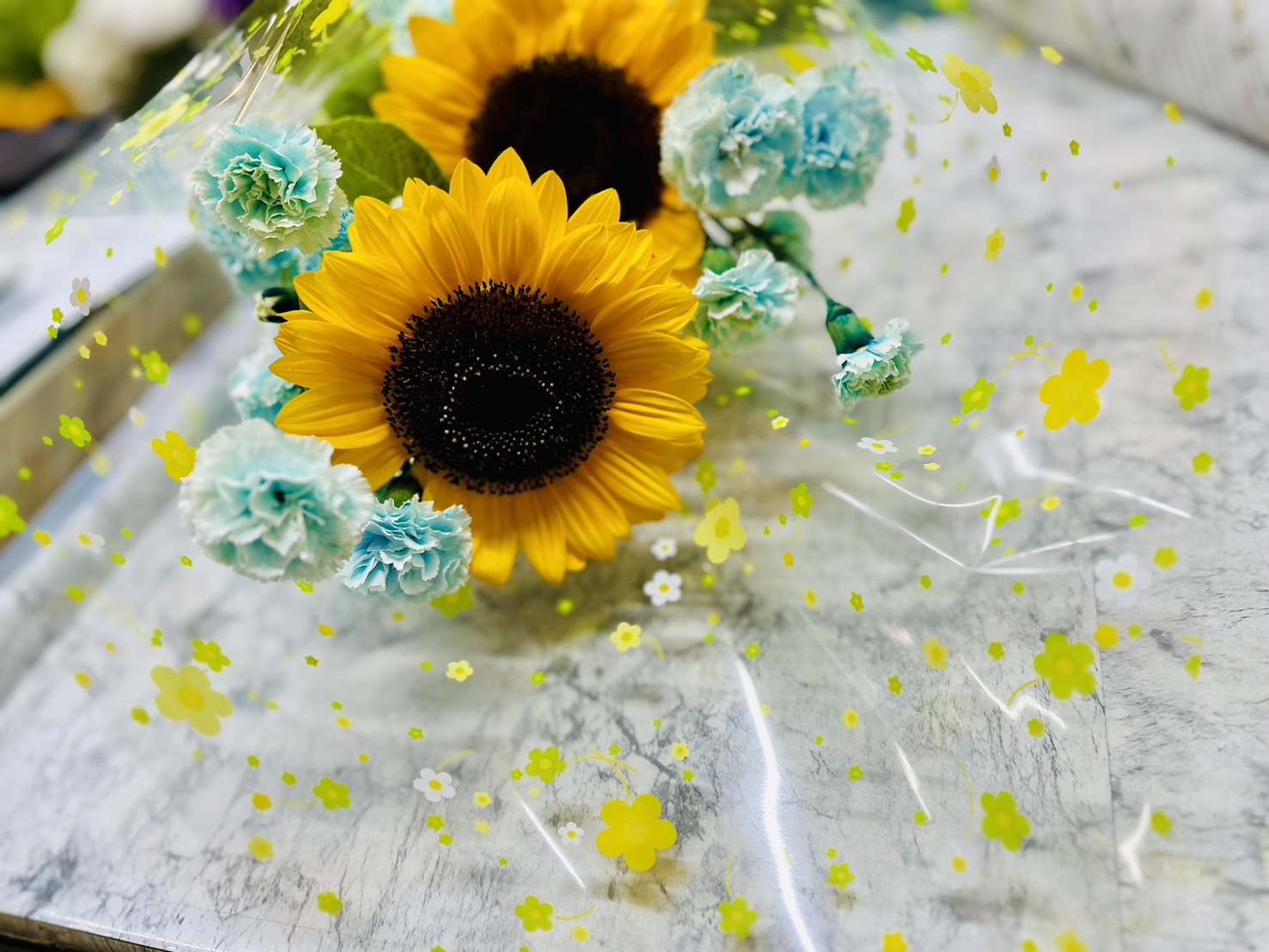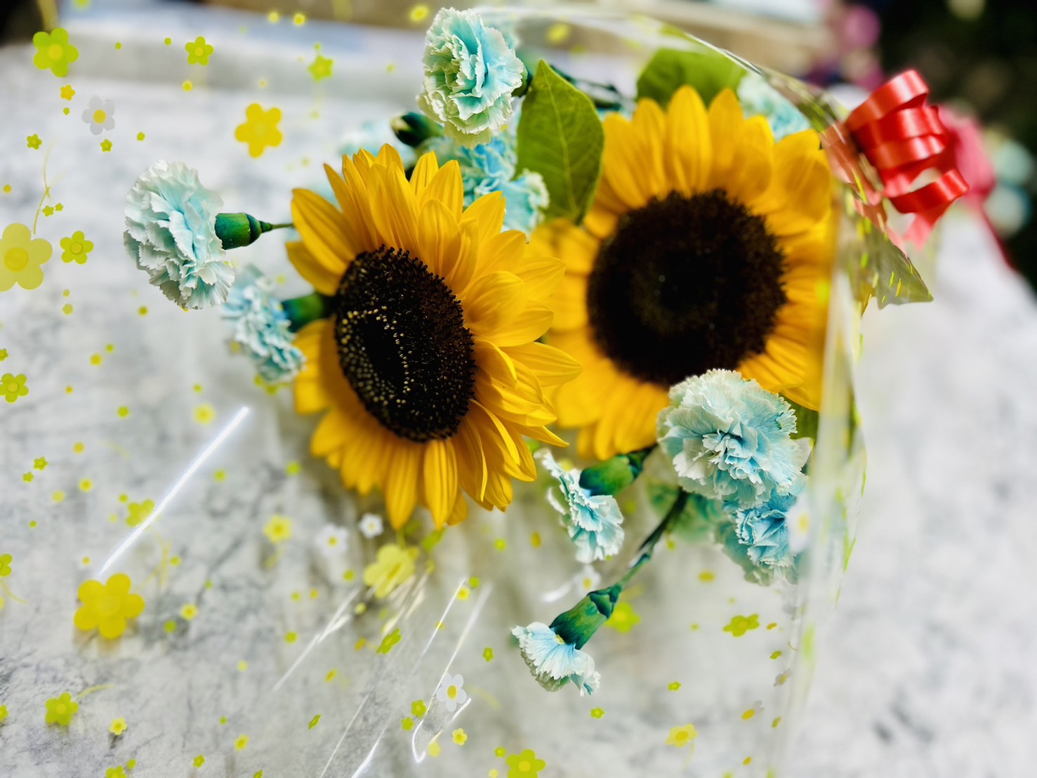 ご主人へ 2024.07.10 旦那さまのお誕生日で、ひまわりの花束を作りました。いつもご来店のお客様です。飲食店をやっていらっしゃいますので、お店に飾ると言っていました。染めた水色のカーネーションと爽やかに仕上がりました。 ご予約の花束 お盆のお花