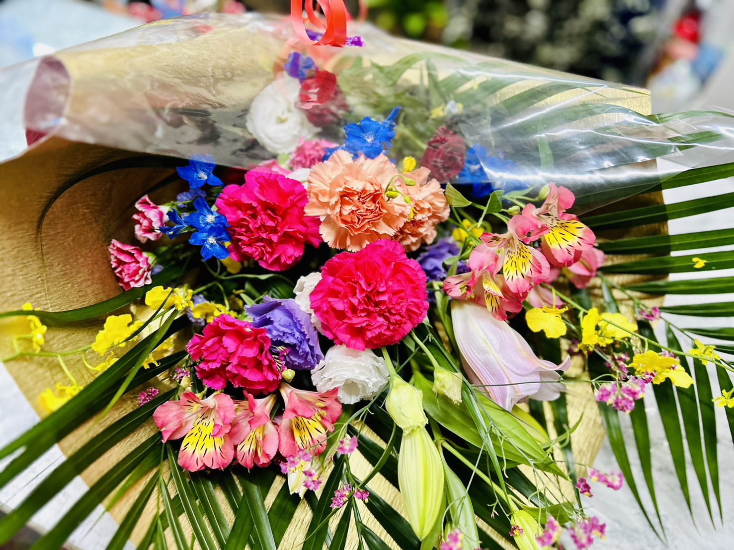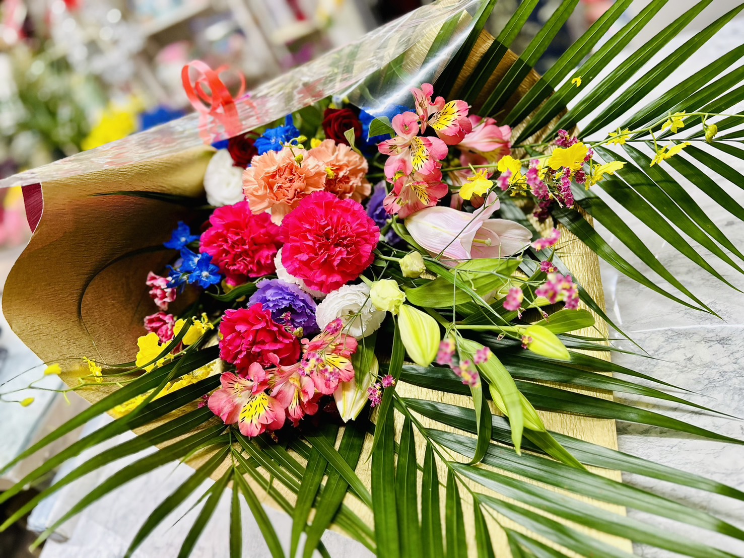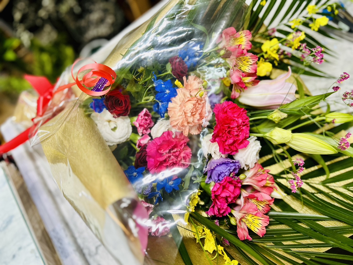 お電話でご予約頂きました。今日は、お母さんの誕生日で、花束をお任せでご注文頂きました。姉妹で、当店をご利用下さり、ありがとうございます。