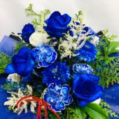 4.青い花ご指定の楽屋花です。青色に染めるのは、当店でやっています。ご予約で受付中