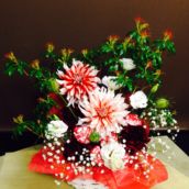 ピアノリサイタルをされる奥様へご主人様からの贈り物でした。暖色系のご注文でした。インパクトある、ダリアをあしらってみました。