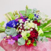 エステサロンのオープンのお祝用です。女性らしいピンクと赤をメインにした華やかな花束ができました。