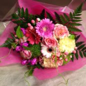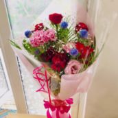 女性らしいピンクと赤をメインにした華やかな花束ができました。